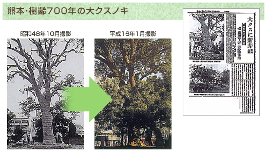 1973年、熊本市の公園にある推定樹齢600~700年の大クスノキが、突然、葉を落として枯れ枝が目立つようになりました。