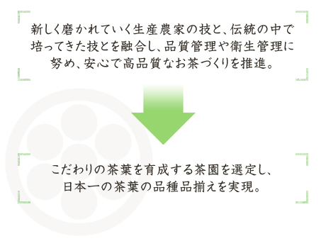新しく磨かれていく生産農家の技と、伝統の中で培ってきた技とを融合し、品質管理や衛生管理に努め、安心で高品質なお茶づくりを推進。→こだわりの茶葉を育成する茶園を選定し、日本一の茶葉の品種品揃えを実現。