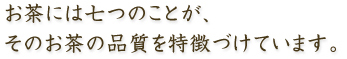 これらの7つのことが、様々な茶葉のひとつひとつの特徴に互いに影響し合い、育ち、作られていきます。茶葉は単一のものを味わうことも楽しみのひとつですが、複数のものを配合(ブレンド)することで、その風味に厚みがでてきます。音楽に喩えるならば、ソロの演奏とオーケストラの違いと言えば良いのではないでしょうか。茶葉にはメロディを持つもの、リズムを刻むものがあり、また、全体の香味を印象付ける軽快なものや重厚感のあるものなどがあります。それらを配合する指揮者の腕次第でその味わいに一層の深みを生み出し、私たちを楽しませてくれるものとなります。この配合(ブレンド)のことを日本茶業界では合組み「ごうぐみ」と呼びます。7つのこうしたことを心地よく感じていただき、一杯のお茶を楽しんでいただければ幸いです。